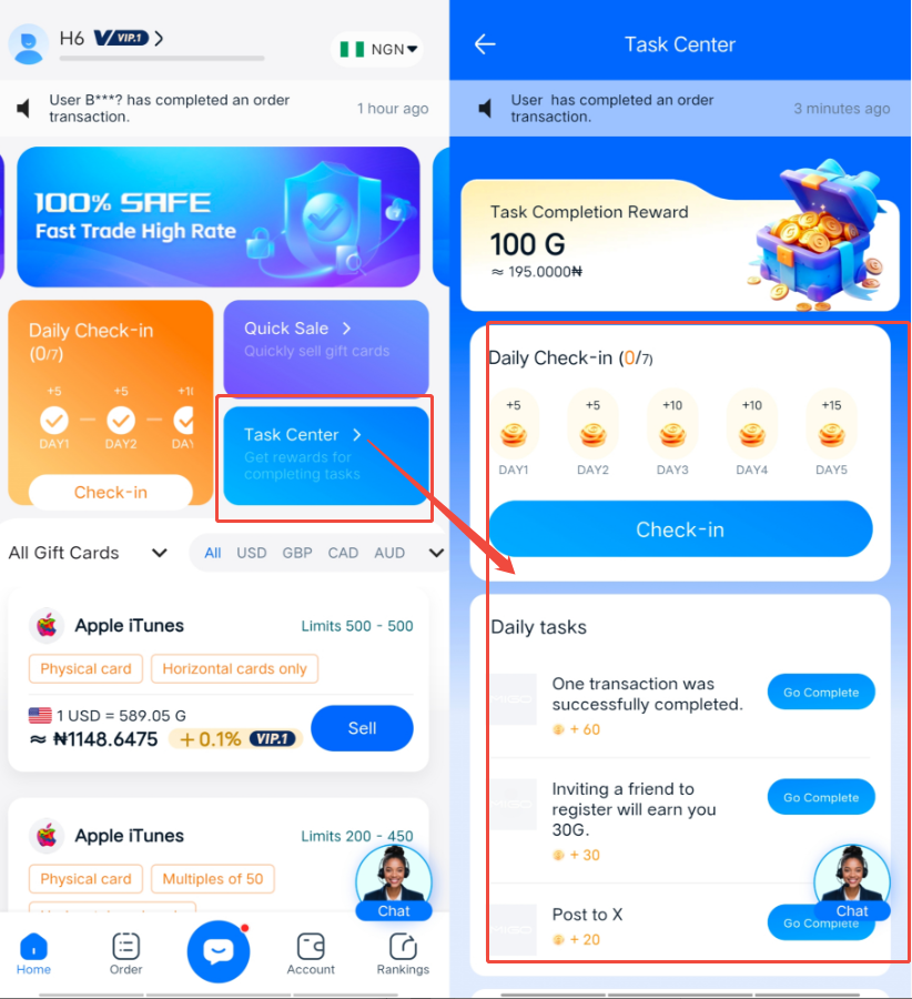 2. In the Task Center, you can check in daily and complete daily tasks.